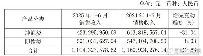 今年由于消费环境变化以及春节提前、销售旺季窗口有所压缩,公司冲泡奶茶业务营收暴跌,上半年收入4.23亿元,同比减少31.04%(去年同期为个位数降幅)。