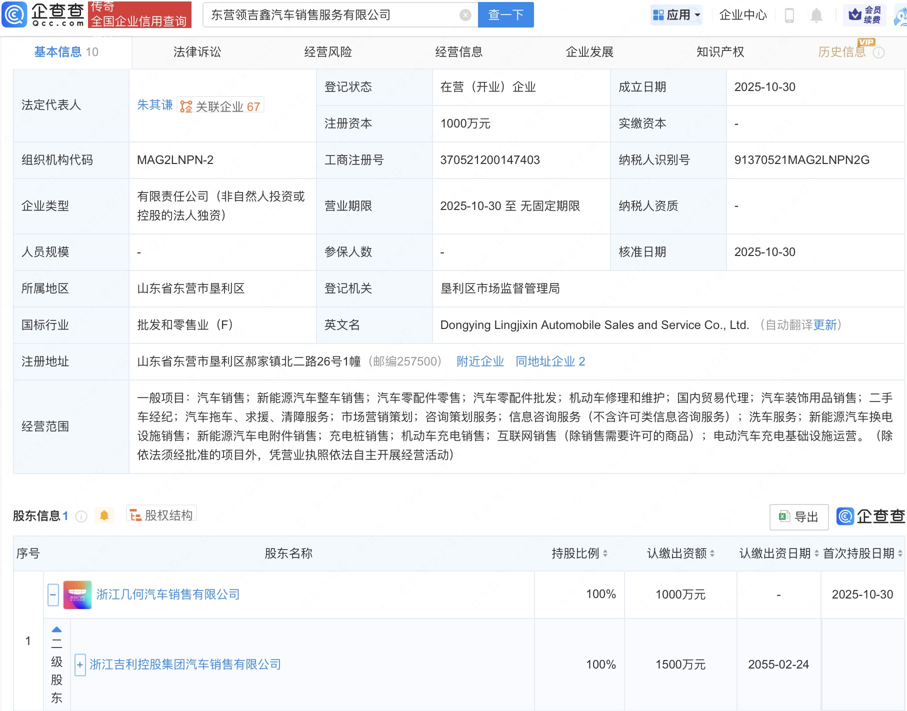 近日手机股票配资软件 ,东营领吉鑫汽车销售服务有限公司成立,法定代表人为朱其谦,注册资本1000万人民币,经营范围包括新能源汽车整车销售、汽车零配件零售、汽车零配件批发等。企查查股权穿透显示,该公司由浙江吉利控股集团汽车销售有限公司间接全资持股。